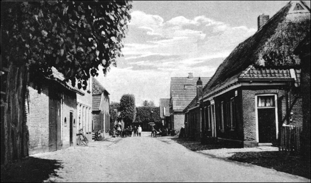 Op de achtergrond is achter de leilinden is de voorgevel van boer en wethouder Harm (?) Hessels te zien.