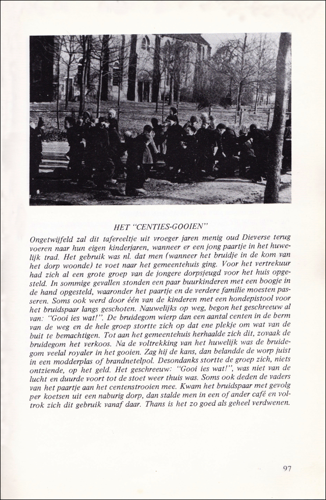 Ongetwijfeld zal dit tafereeltje uit vroeger jaren menig oud-Dieverse terug voeren naar hun eigen kinderjaren, wanneer er een jong paartje in het huwelijk trad. Het gebruik was namelijk dat men (wanneer het bruidje in de kom van het dorp woonde) te voet naar het gemeentehuis ging. Voor het vertrekuur had zich al een grote groep van de jongere dorpsjeugd voor het huis opgesteld. In sommige gevallen stonden een paar buurkinderen met een boogje in de hand opgesteld, waaronder het paartje en de verdere familie moesten passeren. Soms ook werd door één van de kinderen met een hondepistool voor het bruidspaar langs geschoten. Nauwelijks op weg, begon het geschreeuw al van: “Gooi ies wat !” De bruidegom wierp dan een aantal centen in de berm van de weg en de hele groep stortte zich op dat ene plekje om wat van de buit te bemachtigen. Tot aan het gemeentehuis herhaalde zich dit, zo vaak de bruidegom het verkoos. Na de voltrekking van het huwelijk was de bruidegom veelal royaler in het gooien. Zag hij de kans, dan belandde de worp juist in een modderplas of brandnetelpol. Desondanks stortte de groep zich, niets ontziende, op het geld. Het geschreeuw: “Gooi ies wat !”, was niet van de lucht en duurde voort tot de stoet weer thuis was. Soms ook deden de vaders van het centen strooien mee. Kwam het bruidspaar met gevolg per koetsen uit een naburig dorp, dan stalde men in een of ander café en voltrok zich dit gebruik vanaf daar. Thans is het zo goed als geheel verdwenen.