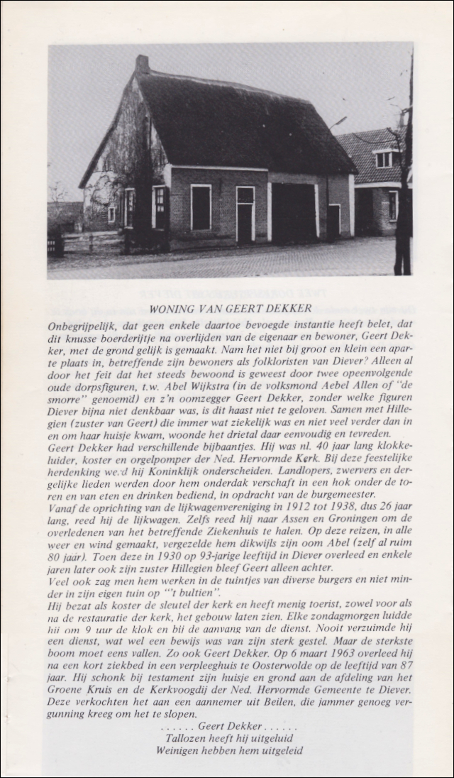 Arend Mulder schreef in 1975 in zijn boekje ‘De historie en pre-historie van Diever in woord en beeld’ op bladzijde 93 over dorpsfiguur Geert Dekker: Tallozen heeft hij uitgeluid, weinigen hebben hem uitgeleid.