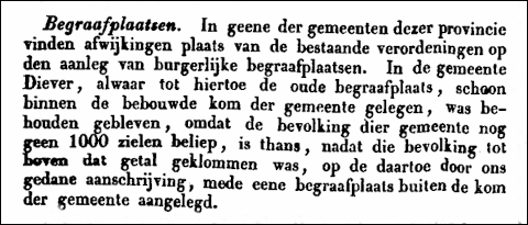 In de gemeente Diever, alwaar tot hiertoe de oude begraafplaats, schoon binnen de bebouwde kom der gemeente gelegen, was behouden gebleven, omdat de bevolking dier gemeente nog geen 1000 zielen beliep, is thans, nadat die bevolking tot boven dat getal geklommen was, op de daartoe door ons gedane aanschrijving, mede eene begraafplaats buiten de kom der gemeente aangelegd.